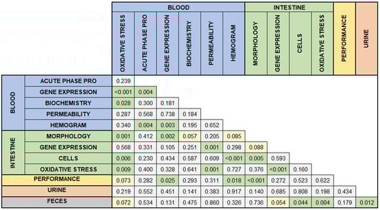 Several associations were observed between the presence and absence of specific types of responses (Figure 7). Growth performance was associated with blood gene expression (p = 0.025), hemogram (p = 0.018), and intestinal morphology (p < 0.001). Additionally, oxidative stress in the blood was associated with oxidative stress in the intestine (p = 0.009). Urinary assessments were associated only with fecal analyses, which in turn were linked to cellular and oxidative stress evaluations in the intestines.