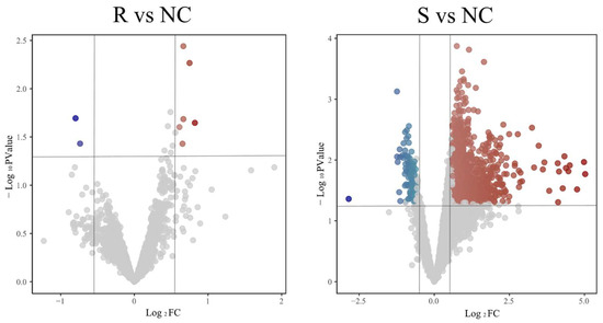 Volcano plot of DEGs group comparison. R represents the resistant phenotype, S represents the susceptible phenotype, and the healthy group is denoted by NC. Log2 Fold Change (Log2FC) represents the logarithm to base 2 of the ratio of gene expression levels under two conditions, indicating the magnitude and direction of differential gene expression. Red dots represent significantly up-regulated genes, and blue dots represent significantly down-regulated genes (|Log2FC| ≥ 0.6 and p ≤ 0.05). Gray dots represent non-significantly changed genes (|Log2FC| < 0.6 or p > 0.05).