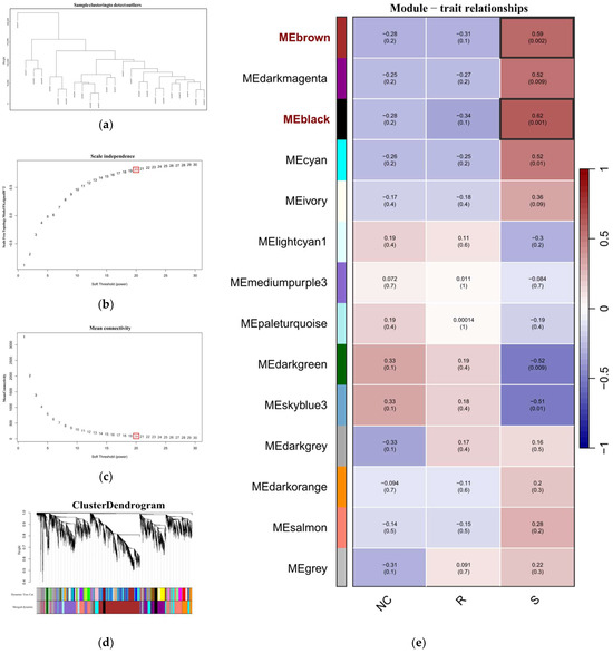 (a) The sample dendrogram, showing the similarity between samples through the dendrogram; (b,c) the soft-thresholding selection plot, which illustrates the network’s topological properties under different soft-thresholding powers (soft threshold power, defined as the exponent β applied to the correlation matrix to enhance strong gene correlations and construct a scale-free network). (b) shows the scale independence, indicating how well the network fits a scale-free topology (R2), while (c) displays the mean connectivity index of the scale-free topology model. By selecting an appropriate soft-thresholding power (β = 20 in this analysis), the network can maintain scale-free characteristics and preserve significant correlations between genes. (d) The cluster dendrogram, which displays the clustering of genes, with genes assigned to different modules based on their expression similarities. Different colors at the bottom represent gene modules identified through the dynamic tree cut method, where each color indicates a group of genes that tend to behave similarly. The dendrogram above shows the hierarchical clustering process, with the height on the y-axis reflecting the degree of dissimilarity between genes—taller branches indicate greater differences. The merging of color blocks at the bottom shows how modules are grouped or related to each other based on their gene expression patterns. (e) The module-trait relationships heatmap, which displays the correlation between different gene modules and traits. Each module is represented with a correlation coefficient to the traits, indicated by both color and numerical values. Red represents positive correlation, green represents negative correlation, and the deeper the color, the stronger the correlation. R represents the resistant phenotype, S represents the susceptible phenotype, and the healthy group is denoted by NC.