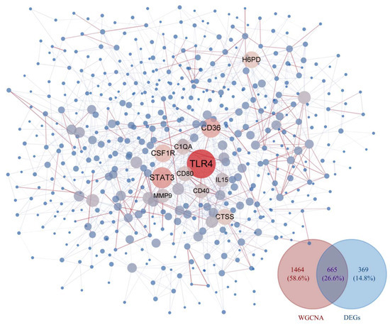 A comprehensive analysis of the DEGs and WGCNA results from dataset GSE69014 identified 665 key genes associated with severe APEC infection in broilers. A PPI network was constructed using STRING and imported into Cytoscape, where TLR4 was found at the core of the PPI network, suggesting its significant biological importance; see Figure 3.