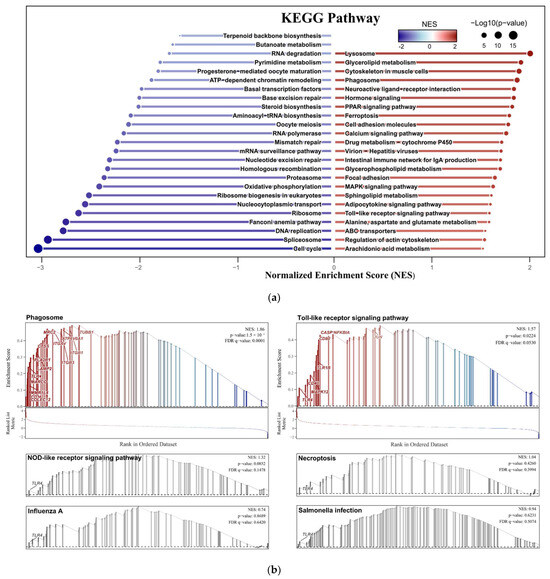 (a) Bidirectional column chart. Displays 48 signaling pathways from the GSEA enrichment analysis based on the KEGG database, with those significantly activated (red) and suppressed (blue) identified (|Normalized Enrichment Score, NES| ≥ 1.5, p ≤ 0.05); (b) Single-gene enrichment analysis result. GSEA results of the six signaling pathways involved in the TLR4, of which the gray ones are insignificant pathways (p ≥ 0.05).