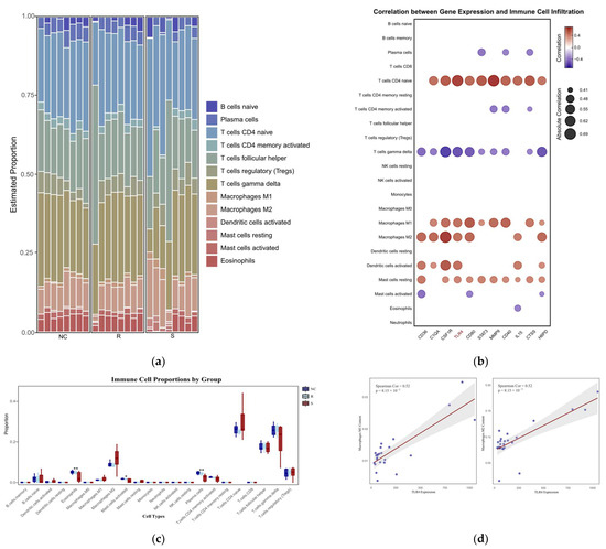(a) The immune cell stacking chart displays the relative abundance of different types of immune cells in each thymus sample. R represents the resistant phenotype, S represents the susceptible phenotype, and the healthy group is denoted by NC. (b) The correlation heatmap analyzes the relationships between 11 core genes in the PPI network (Figure 3) and 22 types of immune cells using the Spearman correlation coefficient. The heatmap displays the absolute values of the correlation coefficients (|Cor|), highlighting only the significant correlations between genes and immune cells where |Cor| ≥ 0.4 and p ≤ 0.05; (c) shows the differences in the proportion of each group of immune cells. R represents the resistant phenotype, S represents the susceptible phenotype, and the healthy group is denoted by NC. * p < 0.05 and ** p < 0.01 indicate a statistically significant difference from the NC group. (d) Scatter plots showing the association of TLR4 gene expression with M1 and M2 macrophage subsets (calculated using Spearman correlation).