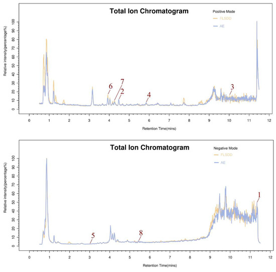 The total ion chromatograms of FLSDD and AE. By matching the results with a database, a total of eight natural compounds targeting TLR4 were identified in LC–MS positive and negative ion modes. As indicated by the numbers in the figure, detailed information of the compounds is shown in Table 3.