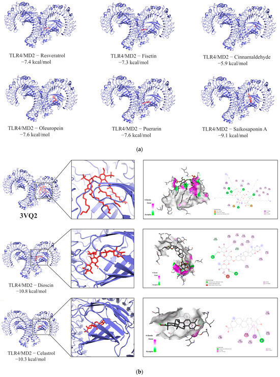 (a) The molecular docking results. The blue part is the protein receptor and the red part is the ligand. Show the binding modes of the TLR4-MD2 complex dimer and six components. (b) Binding interactions of LPS and natural compounds with the TLR4-MD2 complex dimer. The PDB entry 3VQ2 demonstrates the binding interaction between LPS and the TLR4-MD2 complex dimer. Additionally, the binding modes of two natural compounds (Dioscin and Celastrol) with the same protein receptor from 3VQ2 are shown alongside it.