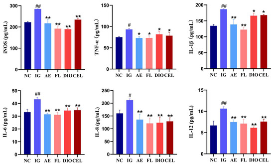 ELISA detection of serum inflammatory factor levels in each treatment group, # p < 0.05 and ## p < 0.01 indicate a statistically significant difference from the NC group; * p < 0.05 and ** p < 0.01 indicate a statistically significant difference from the IG group; NC denotes the control group, IG denotes the APEC infection group, AE denotes the dregs aqueous extract treatment group, FL denotes the fermented liquid treatment group, and DIO and CEL denote the Dioscin and Celstrol treatment groups, respectively.