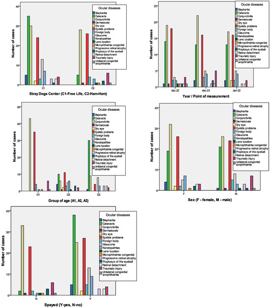 Generally, the ocular disease (Figure 2) was not associated with sex (female vs. male, χ2 = 20.043, p = 0.170) or the moments of measurement (P1, P2, and P3, χ2 = 17.933, p = 0.960). However, it was associated with the Stray Dogs Center (Free Life vs. Ham Ham, χ2 = 44.933, p < 0.000), age group (A1, A2, and A3, χ2 = 148.487, p < 0.000), and splayed class (yes vs. no, χ2 = 62.830, p < 0.000).