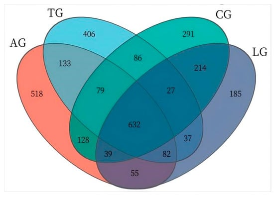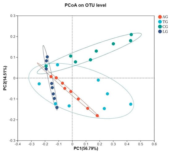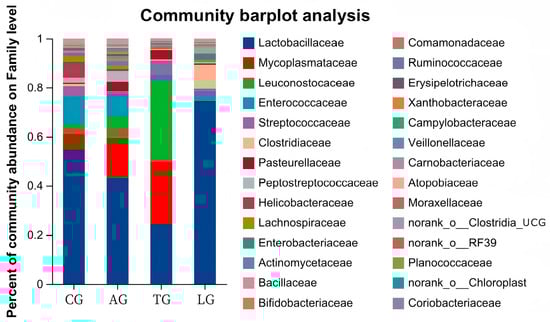 The jejunal sample microbiota assessment of alpha diversity was conducted using diversity indices (Shannon and Simpson) along with richness estimators (Chao1 and ACE). As shown in Table 3, the richness estimators (ACE and Chao1) increased for AG, TG, and LG compared to CG. However, the Simpson indices were significantly lower than that of CG (p < 0.05), while the Shannon indices were elevated in comparison to CG. Notably, AG and TG demonstrated greater vigor relative to LG. These findings suggest that the addition of Lactobacillus may enhance the richness and diversity of gut microbiota, particularly in the context of Lactobacillus intervention during E. coli infection. Furthermore, the beta diversity observed in LG was lower than that in TG and AG, suggesting a beneficial influence on gut microorganisms affected by E. coli infestation due to Lactobacillus supplementation. Principal coordinate analysis (PCoA) employing the weighted UniFrac similarity method revealed that PC1 and PC2 explained 56.79% and 14.51% of the total variance among the samples, respectively. This analysis illustrated that gut samples from distinct groups formed separate clusters in the ordination space (Figure 4), with microbiota composition displaying greater divergence following E. coli infection and Lactobacillus intervention compared to samples taken from CG. The microbiota composition exhibited increased divergence within the Lactobacillus treatment group alongside the E. coli infestation.