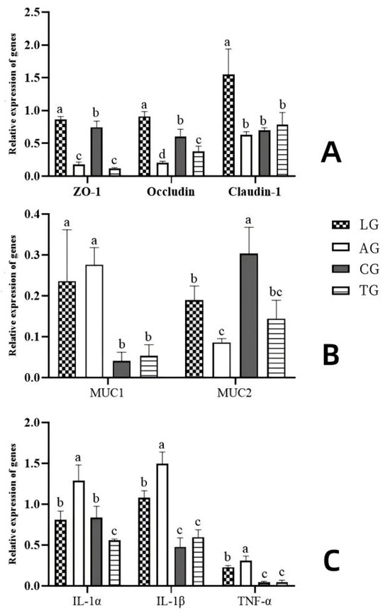 Effects of Lactobacillus supplementation on the target genes in E. coli-infected mouse guts ((A) shows the tight junction protein-coding genes, (B) shows the digestive metabolism protein-coding genes, and (C) shows the inflammatory factor protein-coding genes). Note. Different letters represent significant differences (p < 0.05), while the same letters represent no significant differences (p > 0.05).