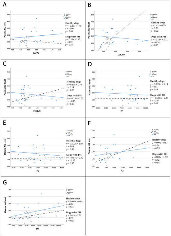 Linear correlations between plasma NO and left-heart echocardiographic variables in healthy dogs (black dotted line) and dogs with PH (blue line). In PH dogs, plasma NO is moderately correlated with CI (F) and SVI (G) (p < 0.05). No significant correlations with plasma NO are observed for LA/Ao (A), LVIDdN (B), LVIDsN (C), EF (D), or FS (E) in either group. Abbreviations: PH—pulmonary hypertension; NO—nitric oxide; LA/Ao—left atrial to aorta ratio; LVIDdN—normalized left ventricular internal diameter in diastole; LVIDsN—normalized left ventricular internal diameter in systole; EF—ejection fraction; FS—fractional shortening; CI—cardiac index; SVI—stroke volume index.