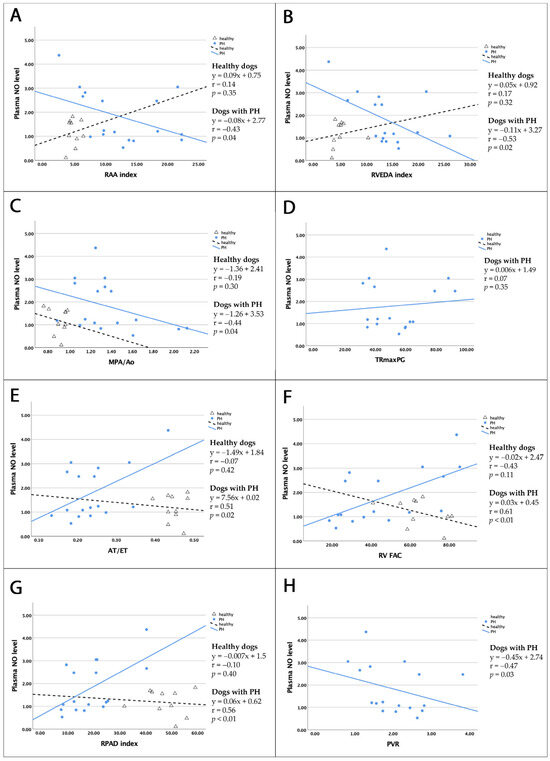 Linear correlations between plasma NO levels and right cardiac echocardiographic parameters in healthy dogs (black dotted line) and dogs with PH (blue line). NO levels in dogs with PH were positively moderately correlated with AT/ET (E), RV FAC (F), and RPAD index (G); negatively weakly correlated with RAA index (A), MPA/Ao ratio (C), and PVR (H); and negatively moderately correlated with RVEDA index (B). No correlations were observed between NO levels and TRmaxPG (D) (p < 0.05). Abbreviations: PH—pulmonary hypertension; NO—nitric oxide; RAA—right atrial area; RVEDA—right ventricular end-diastolic area; MPA/Ao—main pulmonary artery to aorta ratio; AT/ET—acceleration to ejection time ratio; PVR—pulmonary vascular resistance; TRmaxPG—maximal pressure gradient of tricuspid regurgitation; RV FAC—right ventricular fractional area change; RPAD—right pulmonary artery distensibility.