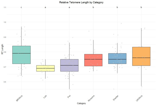 Relative telomere length in the sampled dogs (N = 250) based on their background category. Different colors represent different dogs’ groups (green = BR work, yellow = laboratory, purple = pet, red= rehomed, blue = shelter, orange = UK work). Gray circles indicate the dispersion of data points. Boxes represent interquartile ranges, tick lines represent the median, and whiskers show maximum and minimum values. Different letters indicate statistical significance at p < 0.05.