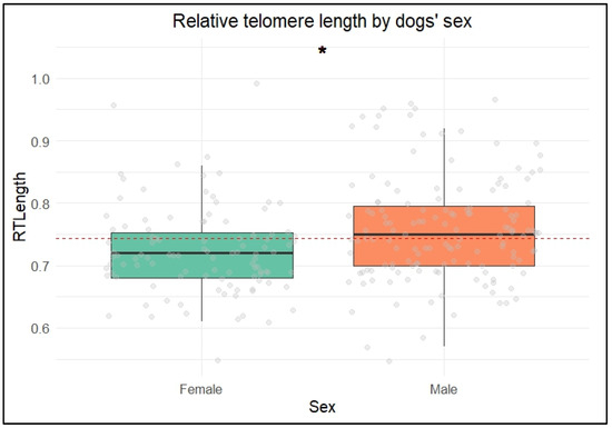 Differences in relative telomere length between male and female dogs. Different colors represent different sexes (green = female, orange = male). Gray circles indicate the dispersion of data points. Boxes represent interquartile ranges, tick lines represent the median, and whiskers show maximum and minimum values. The star indicates statistical significance at p < 0.05.