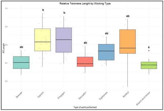 Relative telomere length (rTL) differences between police dogs based on the type of work the individuals perform. Different colors represent different types of work (emerald green = breeder, yellow = capture, purple = drugs and guns, red= education, blue = explosives, orange = retired, and lime green = search and rescue). The gray circles indicate the dispersion of data points, and the red circles indicate outliers. Boxes represent interquartile ranges, tick lines represent the median, and whiskers show maximum and minimum values. Different letters indicate statistical significance at p < 0.05.