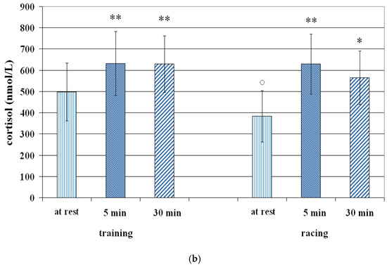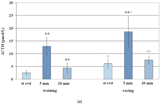ACTH and cortisol concentrations, detected at rest time, were significantly greater, by +145% and +38%, respectively, prior to the racing than prior to the training session; this could be due to the psychological effect of waiting before the race start, as the role of affective processes underpinning temperament, mood and emotional reaction in determining discipline-specific performance [49].
