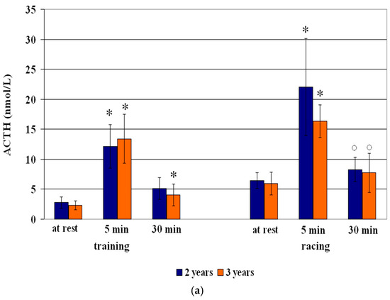This research shows that different endocrine responses to non-competitive and competitive exercise conditions happen according to different ages and sex. ACTH and cortisol increase after the training and racing sessions, confirming previous data recorded in athletic horses after physical exercise, in which both hormones rise between 5 and 30 min after the end of exercise in Thoroughbred horses [23,48], Warmblood horses [16], and showjumping horses [4,25].