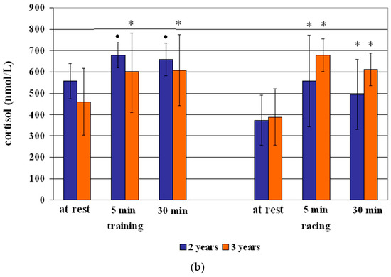 Our results are in line with those reported in a recent study that showed an anticipatory response before racing in Standardbred racehorses, as shown by significant differences in pre-training (97.3 ± 16.4 nmol/L) and pre-race cortisol concentrations (171.8 ± 18.7 nmol/L), respectively [50]. Furthermore, other authors have shown that the participation of horses in equestrian competitions leads to an activation of the hypothalamus-adrenocortical function, reflected by a transient increase in cortisol release, and an increase in sympathoadrenal activity, indicated by a rise in heart rate [26].
