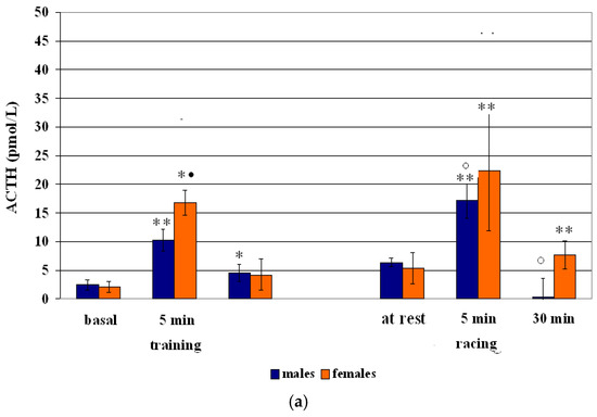 Regarding the sex effect, males showed greater ACTH concentrations at 5 min (+172%; p < 0.001), and females both at 5 min (+68%; p < 0.001), and 30 min (+44%; p < 0.001), than resting values (Table 3 and Figure 2), with a significant effect of racing on the ACTH changes in males (F = 49.95; p < 0.01) and females (F = 10.66; p < 0.01).