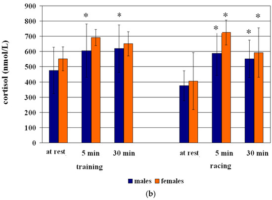Compared to resting values, males showed an increase in cortisol concentrations at 5 min +56%; (p < 0.01) and at 30 min (+47%; p < 0.01), and females showed an increase of cortisol concentrations at 5 min (+79%; p < 0.01) and at 30 min (+46%; p < 0.01) (Table 3 and Figure 2). A racing effect was observed on the cortisol changes in males (F = 9.24; p < 0.001) and females (F = 27.87; p < 0.01).