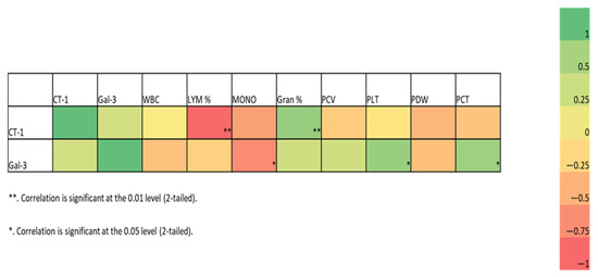 Correlation heatmap and scatterplot. The heatmap shows the Spearman correlation coefficients between all parameters for the combined C/D groups. The colors represent the correlation (−1 to +1), with red indicating more negative and green more positive correlations. * (p < 0.05), ** (p < 0.01). CT-1: Cardiotrophin-1; Gal-3: Galectin-3; WBC: white blood cell; LYM%: lymphocyte percentage; MONO: monocyte count; Gran%: granulocyte percentage; PCV: packed cell volume; PLT: platelet count; PDW: platelet distribution width; PCT: platelecrit.