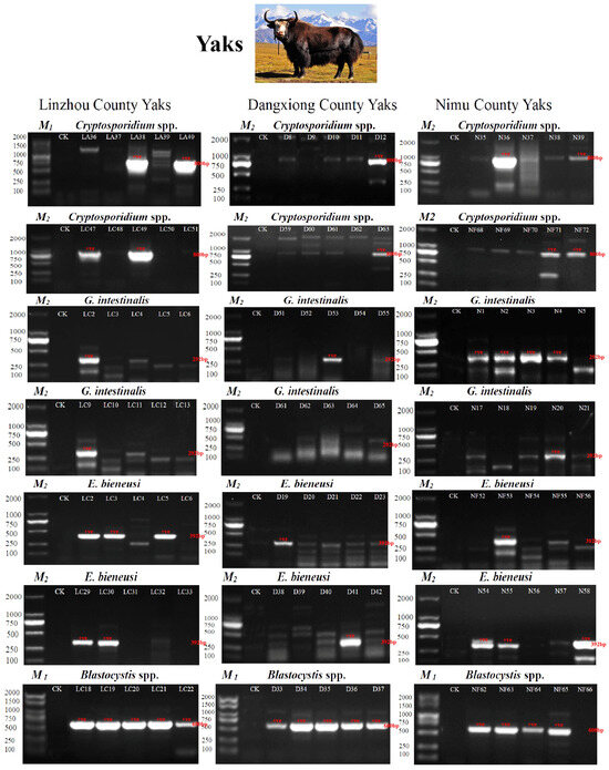 PCR amplification results of SSU rRNA and ITS genes from four protozoan parasites. Two types of Marker ladders were used: M1 and M2. M1: 100, 250, 500, 750, 1000, 1500, 2000 bp. M2: 100, 250, 500, 750, 1000, 2000 bp (M1: Item ID: MD101-01, Vazyme Biotech Co., Ltd., Nanjing, China, M2: Item ID: AG11904, Accurate Biotechnology Co., Ltd., Changsha, China). In Linzhou County, LA indicates yak calves; LC indicates 1–2-year-old yaks. In Dangxiong County, D stands for Dangxiong. In Nimu County, N indicates captive yaks; NF is for grazing yaks. Cryptosporidium spp., G. intestinalis, and E. bieneusi were amplified by nested PCR, and Blastocystis spp. amplified by PCR). CK indicates the negative control.