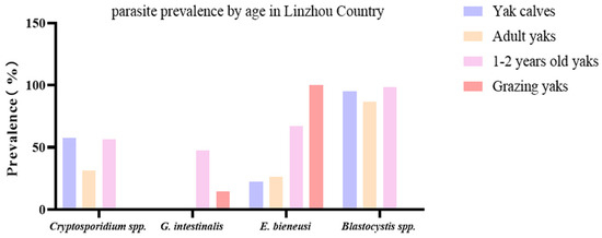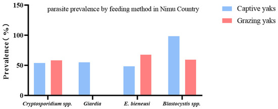 Most yaks solely depend upon grazing grasslands throughout the year, generally without any supplementation, and often face a negative energy balance in winter due to less availability of seasonal forages, so a decrease of 25–30% of their body weight, or even more, occurs in winter [45]. That is why sample collection was conducted in April, when the Plateau animals have sufficient food and water, compared to winter (November to March) when these animals undergo starvation and face bitter cold. Hence, the parasitic load can increase, leading to false overestimation of the parasites’ prevalence, e.g., Cryptosporidium, G. intestinalis, Blastocystis spp., and E. bieneusi [46].