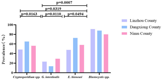 As shown in Table 2, among Linzhou, Dangxiong, and Nimu Counties, the prevalence of Blastocystis spp. alone was the highest, with a prevalence of 90.7, 87.9, and 80.0%; G. intestinalis showed the lowest prevalence of 22.9, 13.6, and 29.3% in Linzhou, Dangxiong, and Nimu Counties, respectively. Among the two types of parasites infected, the combined prevalence of Cryptosporidium spp.+ Blastocystis spp. in Linzhou yaks and Nimu yaks was the highest, with 47.2% and 47.3%, respectively. However, the mixed prevalence of E. bieneusi + Blastocystis spp. in Dangxiong County yaks was the highest, with a prevalence of 72.7%. The prevalence of combined infection of Cryptosporidium spp. + G. intestinalis + E. bieneusi + Blastocystis spp. was found to be 8.1, 6.1, and 9.3% in Linzhou, Dangxiong, and Nimu Counties, respectively (Table 2). In each region, there was a significant difference between Cryptosporidium spp. and G. intestinalis (p = 0.0163), between Cryptosporidium spp. and E. bieneusi (p = 0.0319), between G. intestinalis and E. bieneusi (p = 0.0110), G. intestinalis and Blastocystis spp. (p = 0.0007), and between E. bieneusi and Blastocystis spp. (p = 0.0494; Figure 5).