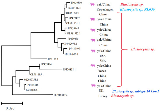 Multiple sequence alignment analysis of the Blastocystis spp. Lhasa isolates and reference sequences. The purple cattle indicate the sequences acquired from the current study. The scale bar at the bottom (0.020) indicates the genetic distance.