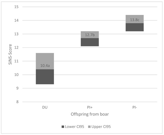 SINS scores in offspring from the three boars (DU = low SINS Duroc boar; PI+ = low SINS Pietrain boar, PI− = high SINS Pietrain boar). Number in box: mean; letter in box: groups with different letters were significantly different at p < 0.001; black box: lower 95% confidence interval (CI95) to mean; grey box: mean to upper 95% confidence interval.