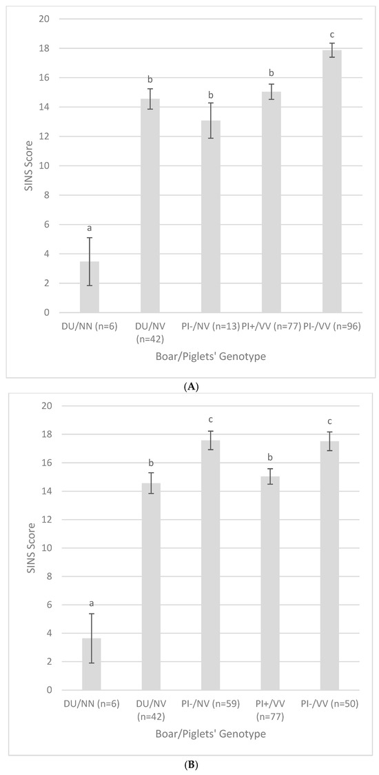 SINS scores by boar/piglet genotype combinations. (A): Series 1; (B): Series 2. DU = Low SINS Duroc boar; PI+ = Low SINS Pietrain boar, PI− = High SINS Pietrain boar; N: Norm allele as in the reference genome Sscrofa11.1; V: variant allele. Statistically significant differences are observed between columns with different letters (p < 0.05).