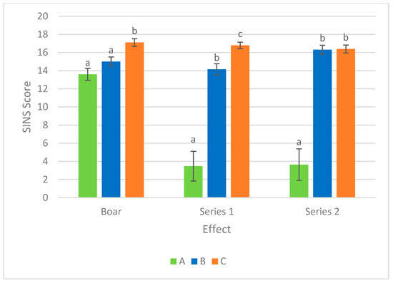 Effects of boar and SNP series on the SINS score. Boar: A = Low SINS Duroc; B = PI+ = Low SINS Pietrain; C = PI− = High SINS Pietrain; SNP series: A = NN; B = NV; C = VV; N: Allele as in the reference genome Sscrofa11.1; V: Variant allele. Statistically significant differences are observed between columns with different letters (p < 0.05).