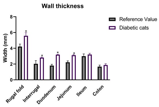 Total wall thickness (mm) of the gastric wall (rugal fold and inter-rugal), duodenum, jejunum, ileum, and colon measured using ultrasound in diabetic cats (n = 13) compared to reference values previously documented in the literature. Values are mean ± SEM, and unpaired Welch’s t-tests were used to compare the two experimental groups (control and diabetic cats). * Statistical difference p < 0.05 vs. correspondent control.
