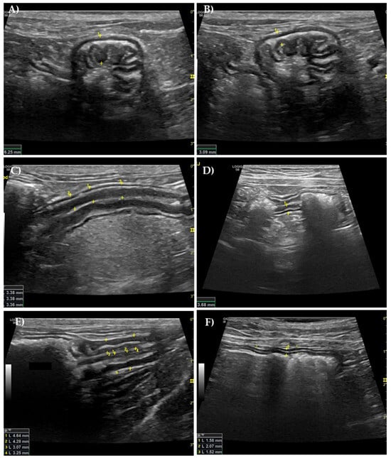 In a normal GI ultrasound, five echogenic layers are identified: the innermost hyperechoic layer corresponds to the surface of the mucosa; the inner hypoechoic layer represents the mucosa; the middle hyperechoic layer is the submucosa; the outer hypoechoic layer is the muscularis propria; and the outermost hyperechoic layer is the subserosa/serosa []. Although there was sometimes an increase in overall wall thickness, normal GI mural stratification was preserved in all ultrasound examinations, allowing for clear identification of the previously described layers.