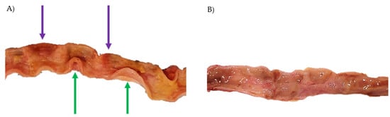 Photos taken during intestinal necropsy of (A) a diabetic cat—jejunal wall exhibited significant thickening, curling upon opening of the intestine (green arrow) rather than falling as expected, accompanied by areas of hyperemia (purple arrows); (B) control cat—normal jejunal wall.