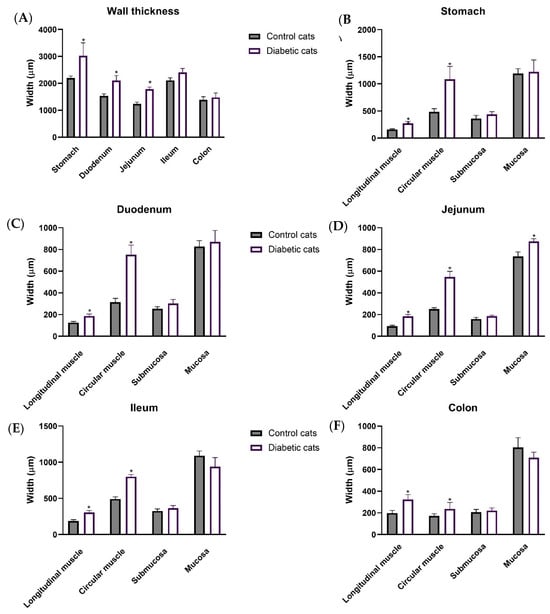 Notably, the muscular layers were consistently increased across all studied sections in the diabetic cats compared to controls (gastric wall—longitudinal muscle: 273.18 ± 34.02 µm vs. 158.67 ± 11.34 µm, circular muscle: 1083.77 ± 237.35 µm vs. 483.25 ± 58.72 µm; duodenum–longitudinal muscle: 186.36 ± 17.99 µm vs. 126.54 ± 9.96 µm, circular muscle: 750.00 ± 90.48 µm vs. 315.77 ± 33.84 µm; jejunum–longitudinal muscle: 184.98 ± 16.41 µm vs. 92.93 ± 8.47 µm, circular muscle: 546.34 ± 52.49 µm vs. 250.11 ± 12.61 µm; ileum—longitudinal muscle: 305.00 ± 26.69 µm vs. 186.42 ± 19.39 µm, circular muscle: 800.46 ± 29.76 µm vs. 492.29 ± 28.74 µm; colon—longitudinal muscle: 323.53 ± 45.41 µm vs. 198.79 ± 23.84 µm, circular muscle: 237.38 ± 58.85 µm vs. 170.98 ± 20.68 µm, respectively, p < 0.05 for all). However, the mucosal layer showed a significant increase only in the jejunum of the diabetic cats (873.38 ± 25.96 µm) compared to control cats (737.23 ± 39.98 µm) (p = 0.0178).