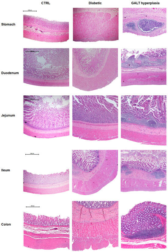 Representative microscopic images of all intestinal segments from control and diabetic cats, stained with hematoxylin and eosin, as well as gut-associated lymphoid tissue (GALT) hyperplasia observed throughout the gastrointestinal tract of diabetic cats. All images were captured at 20× magnification, except for the colon, which was captured at 40×. The scale bar in each image is valid to the entire line.