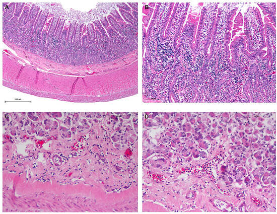 In addition to the quantitative analyses, a qualitative assessment was performed by an experienced pathologist. Diabetic cats exhibited gut-associated lymphoid tissue (GALT) hyperplasia (Figure 6) and inflammatory infiltrate (Figure 7) throughout all sections of the GI tract, which were absent in control animals. The inflammatory infiltrates were predominantly lymphoplasmacytic, with occasional eosinophils (Figure 7B). These infiltrates were more pronounced in the small intestine but were also observed in the stomach and colon. They were primarily located within the mucosa, although a smaller number of inflammatory cells extended into the submucosa. In the small intestine, the infiltrate was so exuberant that it disrupted the normal mucosal architecture, leading to villous enlargement and increased spacing between crypts. Additionally, a marked accumulation of inflammatory cells was noted within intestinal vessels, consistent with leukocytosis (Figure 7D). The histological findings are characteristic of gastroenteritis.