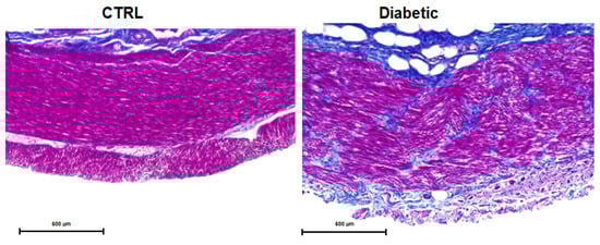 Representative microscopic images of jejunum of controls (CTRL) and diabetic cats, stained with Masson’s trichrome. The blue patches within the muscular layers of diabetic gut indicate collagen deposition. Images captured with a 40× magnification.