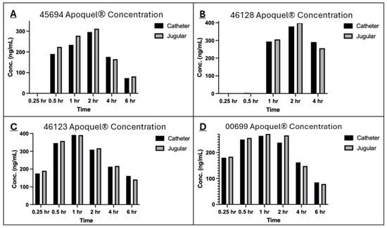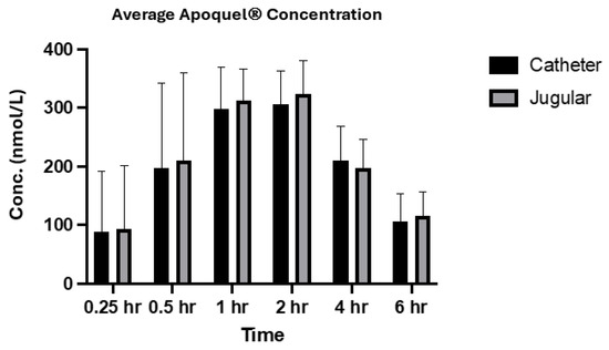 No catheters were removed by the animals and no signs of additional stress or discomfort towards the catheter placement or bandaging were noted and no other adverse events were reported. One catheter (animal 46128) was removed immediately prior to the 6 h time point due to difficulty collecting a sample; however, all other animals had their catheters removed after the 6 h time point due to increased resistance when sampling.