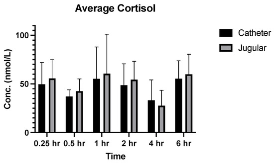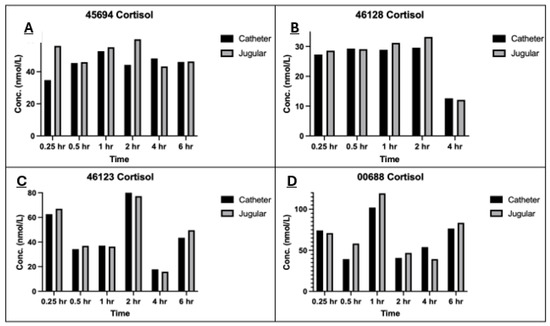 Figure 4). These data suggest that there is a decrease in stress response to the catheter-collection method during the initial time periods, which means using this method where applicable will have an advantageous effect on the welfare of the animals when several blood collections are required within a short time frame. However, this trend is not followed in the later time points for all subjects. For instance, at the 4 and 6 h time point, while two of the animals (46123 and 46128) had very similar lower cortisol concentrations, and two other animals (00688 and 45694) had higher cortisol concentrations. The literature shows there may be a few reasons to explain the result. A parallelism study of the circadian rhythm and cortisol concentration in dogs [
