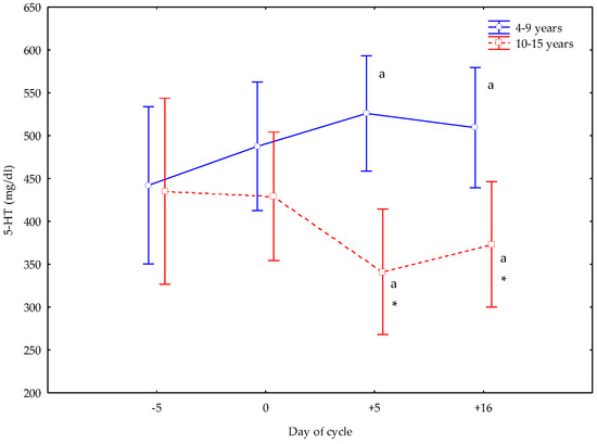 Circulating 5-hydroxytryptamine (5-HT) concentrations (Mean ± S.D.) in cyclic Spanish Purebred mares aged 4–9 years and 10–15 years. Letter indicates significant differences (p < 0.05) versus −5 and 0 days. Asterisk indicates significant differences (p < 0.05) versus mares <10 years old.