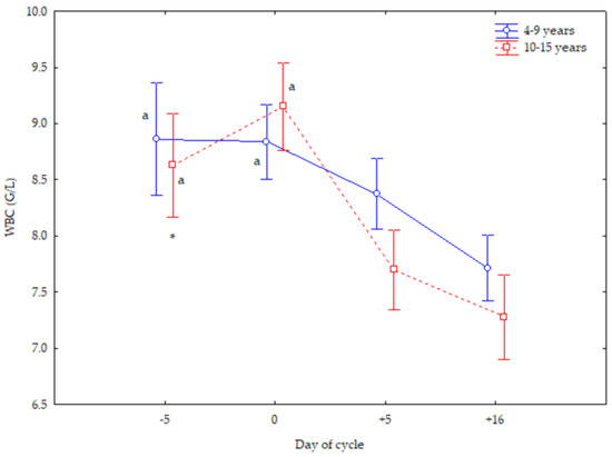White blood cell (WBC) counts (Mean ± S.D.) in cyclic Spanish Purebred mares aged 4–9 years and 10–15 years. Letter indicates significant differences (p < 0.05) versus −5 and 0 days. Asterisk indicates significant differences (p < 0.05) versus mares <10 years old.