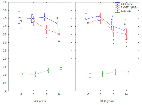 Older mares showed the lowest NFS and LYMPH numbers both at +5 and +16 d (p < 0.05); the younger mares showed the lowest NFS numbers at +16 d, and LYMPH numbers at +5 and +16 d. Older mares showed lower NFS and LYMPH numbers at both +5 and +16 d (p < 0.05) than younger mares. Mares of both ages showed a similar trend for the N/L ratio (Figure 3).