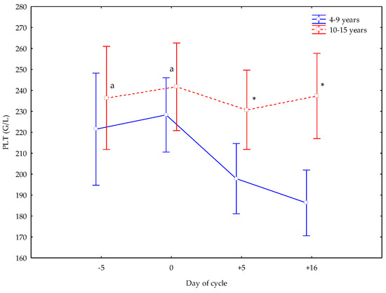 Platelet (PLT) counts (Mean ± S.D.) in cyclic Spanish Purebred mares aged 4–9 years and 10–15 years. Letter indicates significant differences (p < 0.05) versus +5 and +16 days. Asterisk indicates significant differences (p < 0.05) versus mares <10 years old.