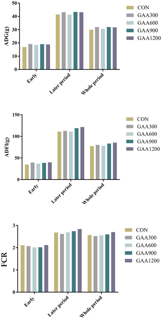 The experimental data were systematically organized and subjected to statistical analysis using Excel 2019 and SPSS version 25.0. A one-way analysis of variance (ANOVA) was performed to evaluate the differences among the treatment groups, allowing us to determine if the guanidinoacetic acid supplementation significantly affected the measured parameters. To discern specific group differences following the ANOVA, Duncan’s multiple-range test was applied as a post hoc analysis, facilitating a thorough comparison of means among the groups.