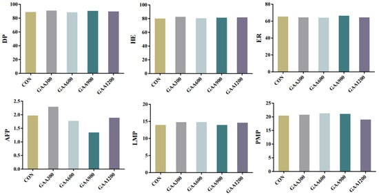 As shown in Figure 2, no statistically significant differences (p > 0.05) were observed in dressing percentage, evisceration rate, abdominal fat percentage, or muscle percentages among the groups. However, the dressing percentage and evisceration rate tended to be higher in the GAA900 group (90.48% and 66.32%, respectively), and this group also showed the lowest abdominal fat percentage (1.35%). Additionally, the GAA600 group achieved the highest leg and pectoral muscle percentages (14.76% and 21.13%, respectively). These findings suggest that moderate-to-high doses of GAA supplementation (600–900 mg/kg) may improve certain carcass traits in yellow-feathered broilers, warranting further investigation.