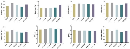 On the morning of the 60th day of the experiment, after the broiler chickens were slaughtered, a whole breast muscle from the same side was taken to measure various meat quality indicators, such as drip loss, pressure loss, pH value, meat color, and shear force. The specific methods are as follows.