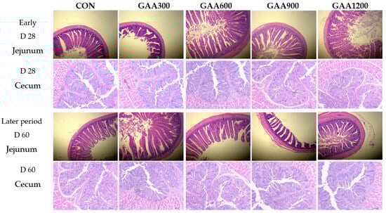 As shown in Table 5 and Figure 4, this study investigated the effects of dietary guanidinoacetic acid (GAA) supplementation on the intestinal morphology of yellow-feathered broilers across different growth stages. Our findings indicate that GAA supplementation, particularly at higher doses (900 mg/kg and 1200 mg/kg), positively influences jejunal morphology during the early growth phase by reducing crypt depth and increasing the villus-to-crypt (V/C) ratio. These changes suggest improved nutrient absorption capacity and efficient intestinal function, supporting enhanced growth performance in the early stages. However, by the later growth phase (60 days), the effects of GAA on intestinal morphology were not sustained, indicating that its influence may be more significant during the critical early development periods. Additionally, GAA supplementation did not affect cecal morphology throughout the study, highlighting a localized effect on the jejunum. Overall, these results underscore the potential of GAA as a beneficial feed additive that can improve intestinal health and growth performance in broilers during crucial early growth stages. Future research should explore the long-term impacts of guanidinoacetic acid (GAA) and its potential mechanisms of action to further elucidate its role in poultry nutrition.
