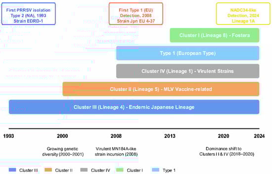 Genetic evolution of PRRSV in Japan (1993–2024). Timeline illustrating the genetic evolution of PRRSV in Japan since 1993, highlighting the emergence and shifts of major lineages and key incursions of novel strains.