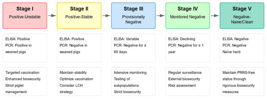 A pioneering regional control initiative in Tahara City, Aichi Prefecture, Japan, starting with 98% of farms being positive for PRRSV in 2011 [52], demonstrated the importance of sustained and coordinated efforts. This multi-stakeholder program utilized the P-JET “PRRS Stage Classification System” (Figure 2) [54] for objective farm status monitoring and targeted interventions. Long-term follow-up reported significant progress: by the first half of FY2021, Stage 5 (negative/clean) farms increased from 0 (in FY2012) to 6 (14.3% of 42 tested farms) and Stage 1 (positive-unstable) farms were eliminated [55]. Concurrently, a shift in regional PRRSV genotypes was observed between FY2020 and the first half of FY2021, with a decrease in wild-type Cluster III strains (by 18%) and an increase in vaccine-related Cluster II strains (by 15%), suggesting a replacement of PRRSV with less pathogenic viruses owing to the extensive vaccination. Furthermore, individual farm case studies within the program indicated viral transitions from the wild-type strain to a vaccine strain following enhanced vaccination strategies, accompanied by improved production parameters such as increased number of born piglets and reduced post-weaning mortality. These improvements in infection status, viral genotype distribution, and production metrics underscore the benefits of such regional programs. Although detailed economic impact analyses for the entire region were not specified as the final outcome, the production gains clearly implied economic advantages. Sustaining motivation for the improvement of veterinary public health and addressing microbiological knowledge gaps remain key challenges for such initiatives. International experiences, such as those in the US, highlight the evolution of voluntary regional control programs and provide valuable insights into structuring effective collaborations and addressing associated challenges [56].
