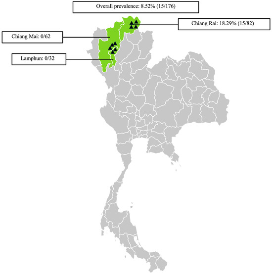 - Jittapalapong, S.; Sangvaranond, A.; Pinyopanuwat, N.; Chimnoi, W.; Khachaeram, W.; Koizumi, S.; Maruyama, S. Seroprevalence of Toxoplasma gondii infection in domestic goats in Satun Province, Thailand. Vet. Parasitol. 2005, 127, 17–22. [Google Scholar] [CrossRef]